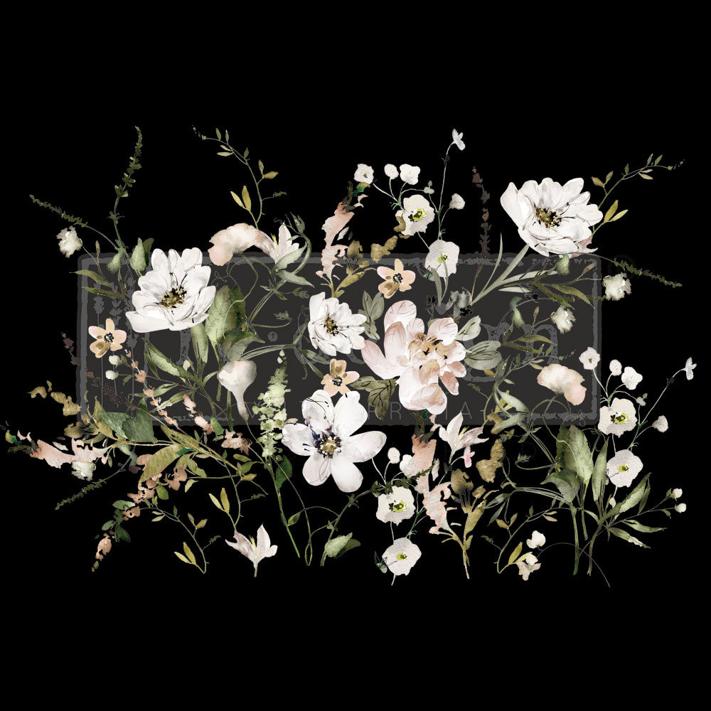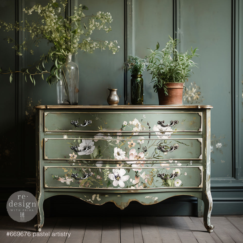 | "The ""Pastels Artistry"" Decor Transfer blooms with soft, dreamy florals, bringing a whisper of spring to your DIY projects. Adorn your favorite furniture piece with this bouquet of gentle whites and pinks, all detailed with delicate greenery. It’s like a brush of nature’s own art, ready to transform your space into a haven of pastel tranquility. total sheet size 24""x35"", cut into 2 sheets - Décor Transfers® are incredibly easy to use. Simply peel off the backing paper, place the transfer onto your desired surface, and rub it with the included tool to transfer the design. The transfer can be cut and rearranged to fit your specific needs, making it a versatile and customizable choice for all your Décor projects. Seal with your favorite water-based sealer or clear wax." |