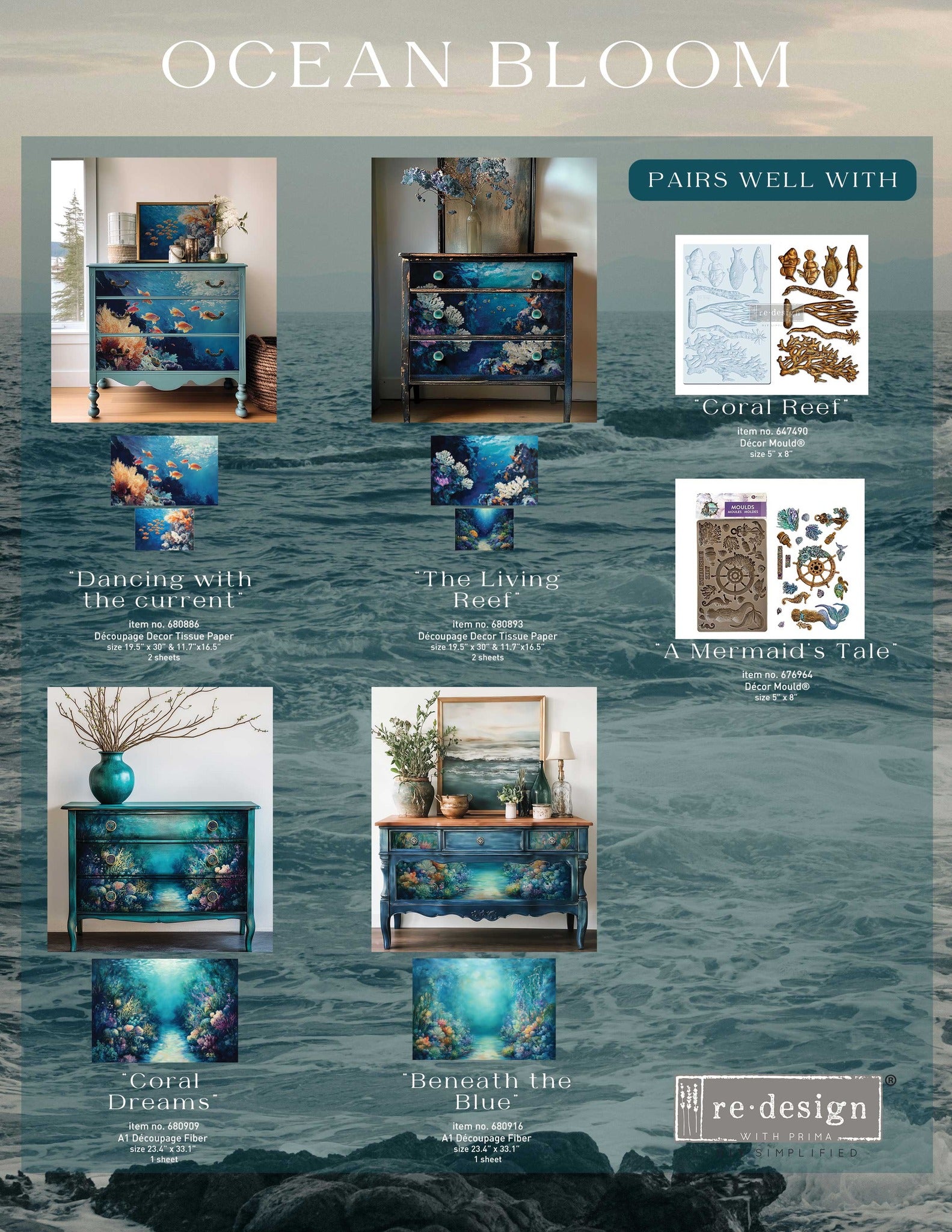 An atmospheric reef scene rich in moody blues, glowing coral blooms, and a soft trail of light leading through the depths. Coral Dreams adds mystery and depth to any surface with its blend of shadow and luminous detail.
