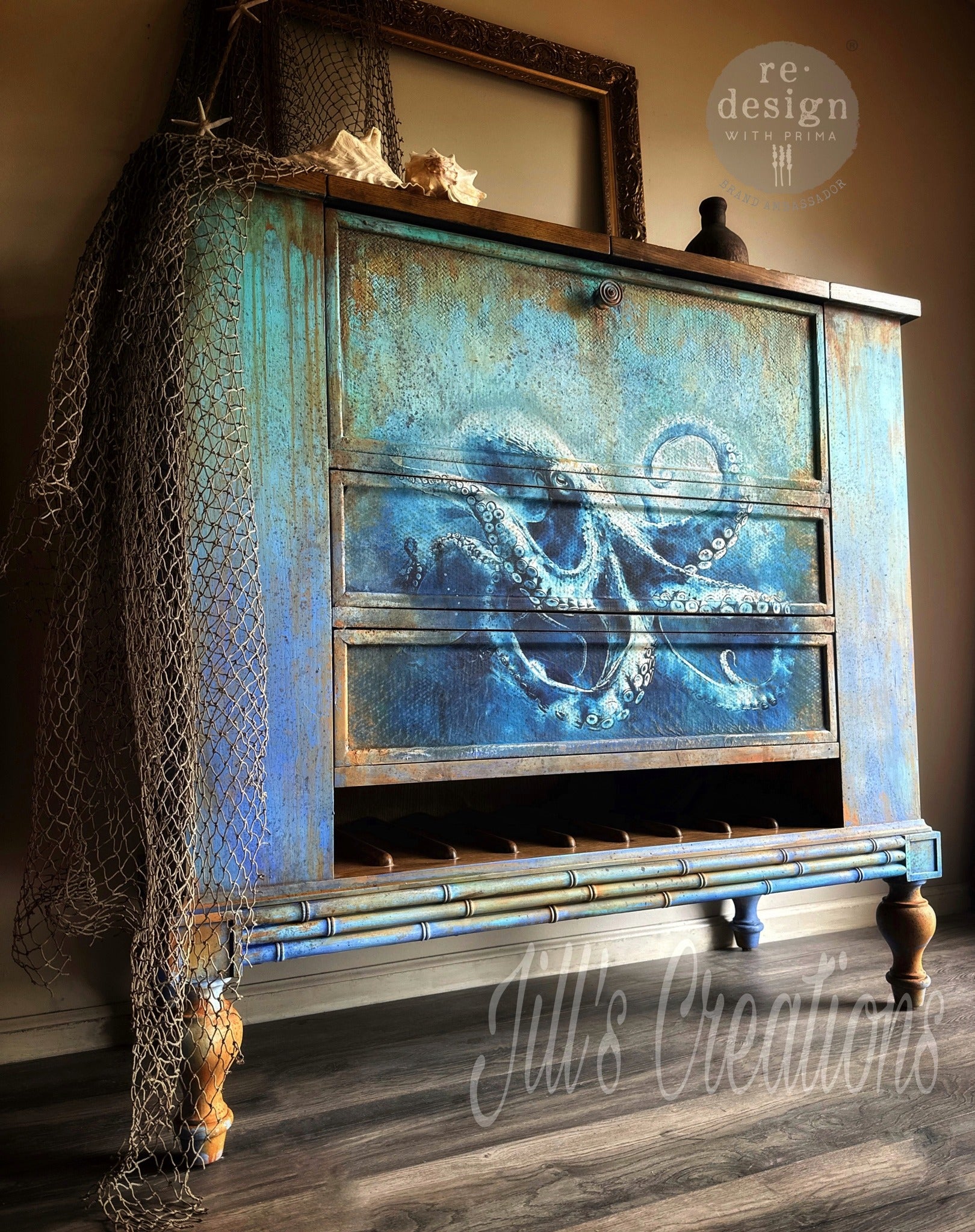 The "Deep Sea Dancer”, a new Redesign with Prima® A1 Decoupage Fiber Paper, transports viewers to the enchanting depths of the ocean, where a wondrous blue octopus glides gracefully amidst a vast expanse of blue, capturing the mesmerizing beauty of marine life in all its splendor. Each tentacle is adorned with rows of suction cups, adding to the creature's otherworldly beauty and allure. Its large, expressive eyes convey a sense of intelligence and curiosity, inviting viewers to peer into the depths of the ocean and discover the wonders that lie beneath. Coordinates beautifully with the new “Ocean Collection”. Our A1 Decoupage Paper is incredibly easy to use. Simply measure and cut the desired amount of paper, add Decoupage Gel on the prepared surface, set paper on top and smooth it with the Scraper Tool or Brayer. Our Décor Tissue Paper is created for use on walls, furniture, and other décor items.