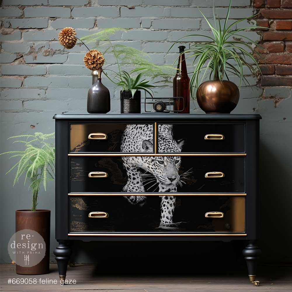 On the prowl, “Feline Gaze” will add a powerful design element to your room with bold black and stark white contrast, while celebrating the wonder of wild animals. Redesign’s A1 Decoupage Paper is printed on sturdy paper, allowing you to create unique and personalized decor pieces, such as wall art, furniture accents, and more. The unique design is perfect for decoupage projects, allowing you to layer and arrange the images to create a stunning finished product. Apply and seal with our Decoupage Gel in Gloss or Matte for best results. Pair with our Brayer or Scraper Tool to reduce wrinkles. 1 sheet, A1 size - (23.4”x33.1”)