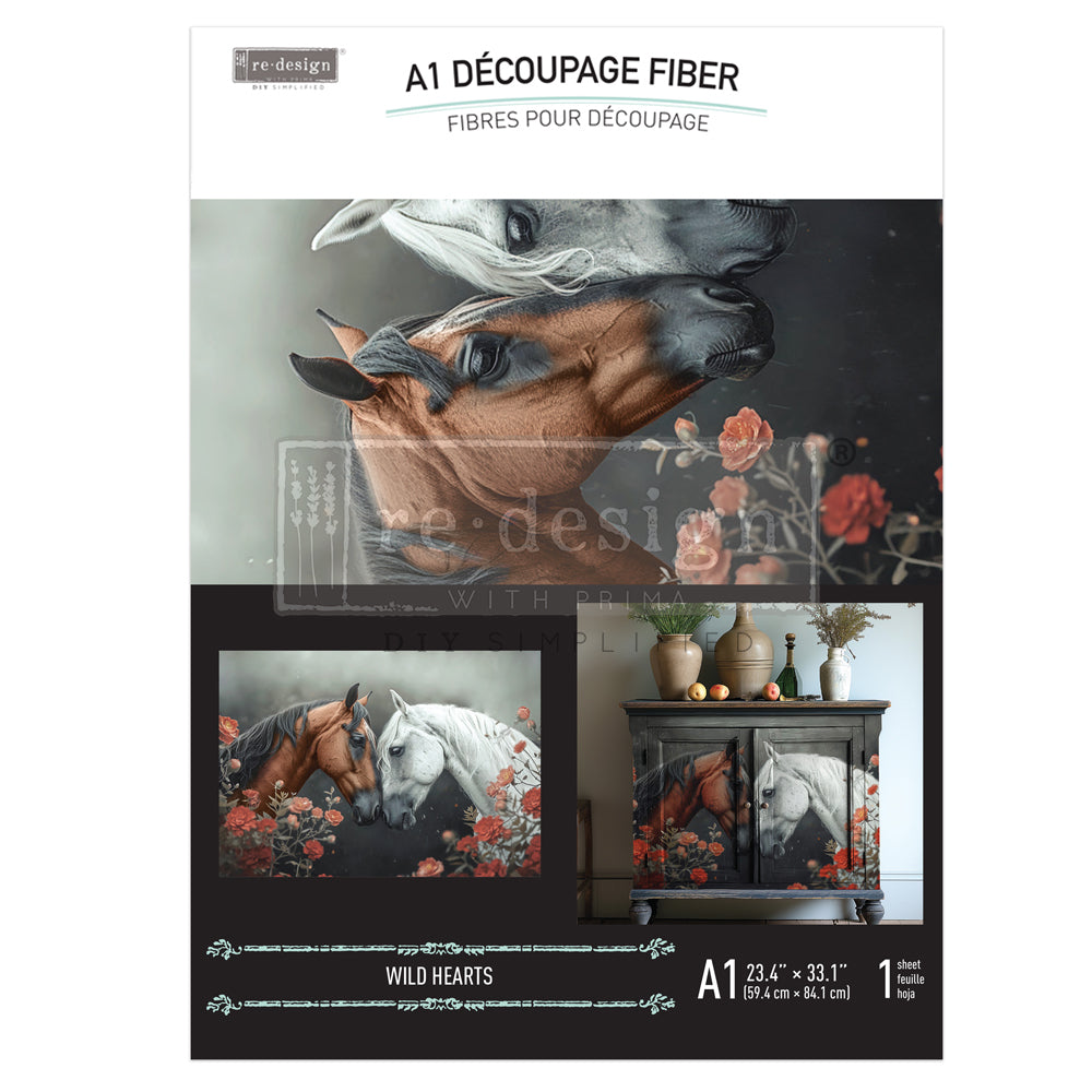 | "1 sheet, A1 size - Redesign with Prima’s® A1 Decoupage Fiber Paper, ""Wild Hearts,"" captures the spirit of untamed beauty with its stunning portrayal of two horses sharing a moment amidst a bed of blooming flowers. Each horse is depicted with lifelike detail, from the curve of their powerful muscles to the gentle arch of their necks, imbuing the scene with a sense of grace and strength. Our A1 Decoupage Paper is incredibly easy to use. Simply measure and cut the desired amount of paper, add Decoupage Gel on the prepared surface, set paper on top and smooth it with the Scraper Tool or Brayer. Our Décor Tissue Paper is created for use on walls, furniture, and other décor items." |