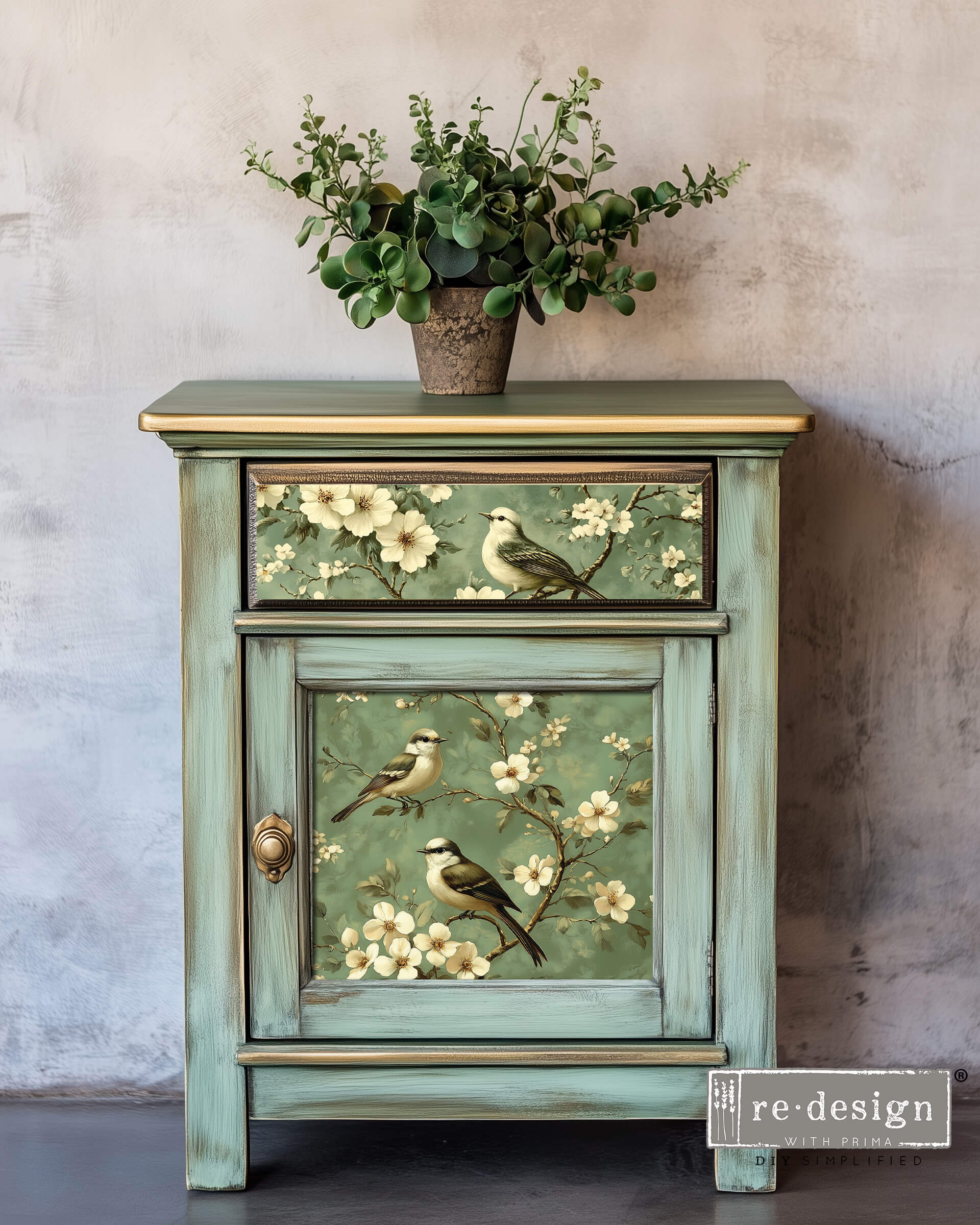 With charming songbirds perched on delicate branches, Chirping Bliss is a new A3 Decoupage Fiber Pack that captures the serene beauty of nature. Soft cream florals bloom against dreamy green backdrops, creating a tranquil, uplifting atmosphere. This beautiful set includes three sheets (11.7"x16.5" each) with four unique designs, created to add a touch of elegance and peaceful charm to your mixed media, furniture, or home décor projects. Let the gentle beauty of Chirping Bliss inspire your creativity and bring a bit of nature’s harmony into your work. For a flawless finish, pair with Decoupage Gel in either Matte or Shine, exclusively from Redesign with Prima®.