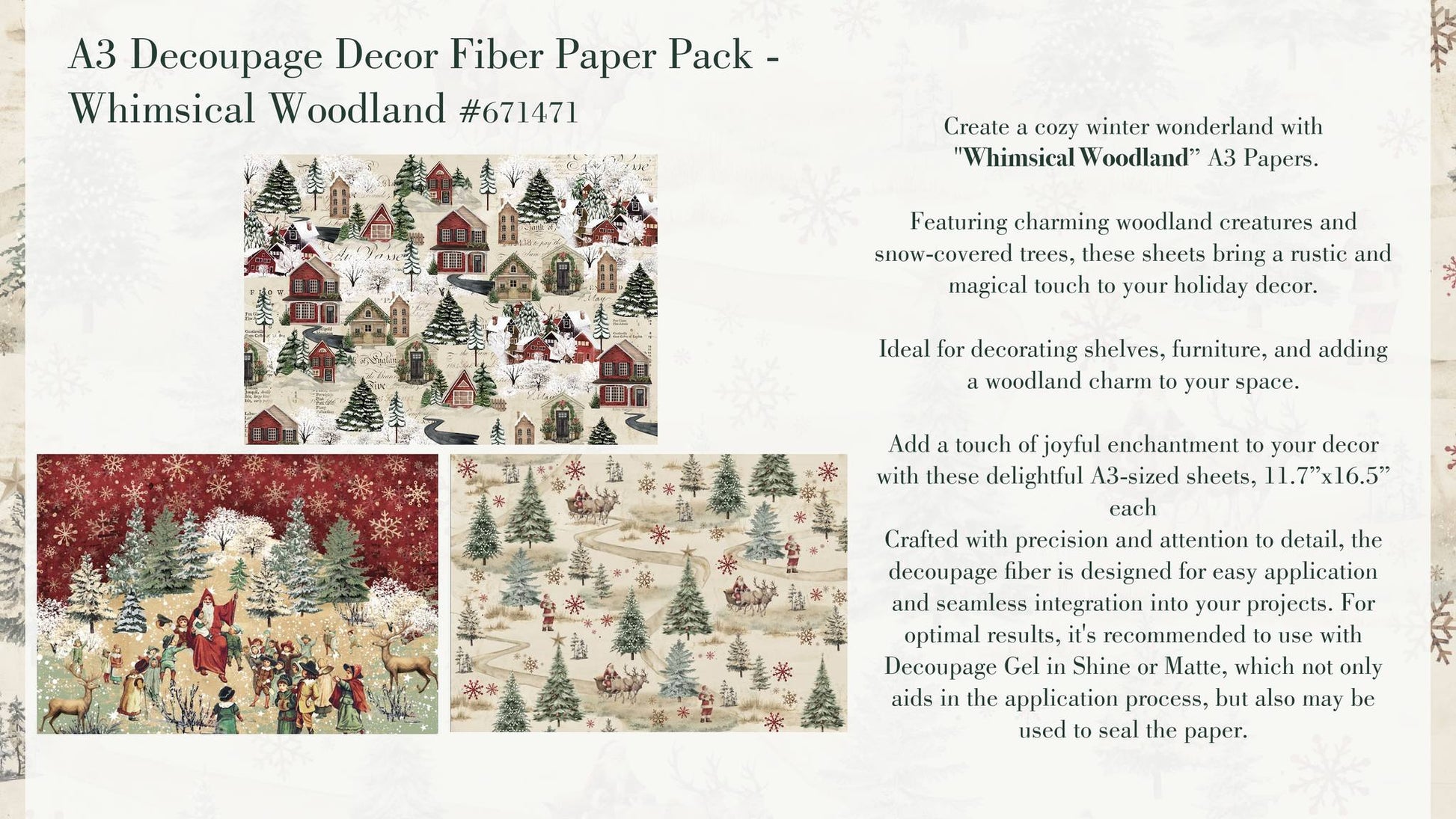| "3 sheets, 11.7""x16.5"" each - Create a cozy winter wonderland with ""Whimsical Woodland” A3 Papers. Featuring charming woodland creatures and snow-covered trees, these sheets bring a rustic and magical touch to your holiday decor. Ideal for decorating shelves, furniture, and adding a woodland charm to your space. Add a touch of joyful enchantment to your decor with these delightful A3-sized sheets, 11.7”x16.5” each Crafted with precision and attention to detail, the decoupage fiber is designed for easy application and seamless integration into your projects. For optimal results, it's recommended to use with Decoupage Gel in Shine or Matte, which not only aids in the application process, but also may be used to seal the paper. " |