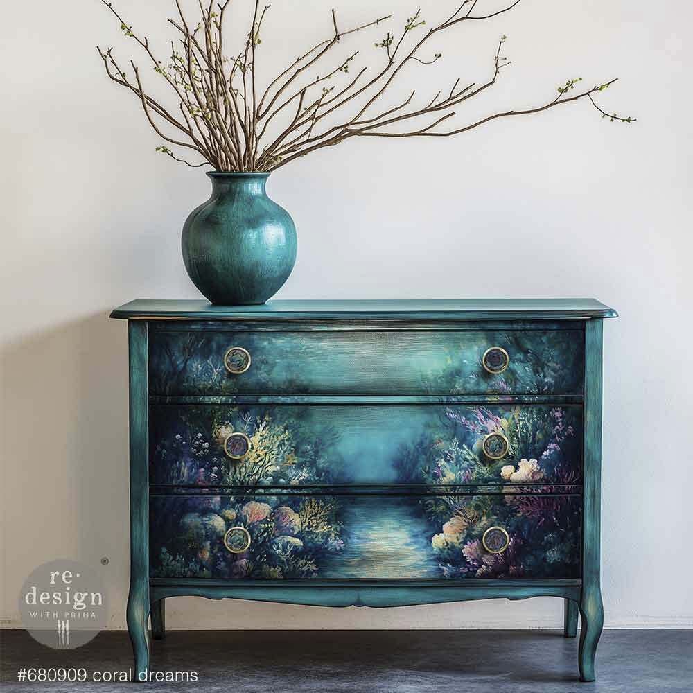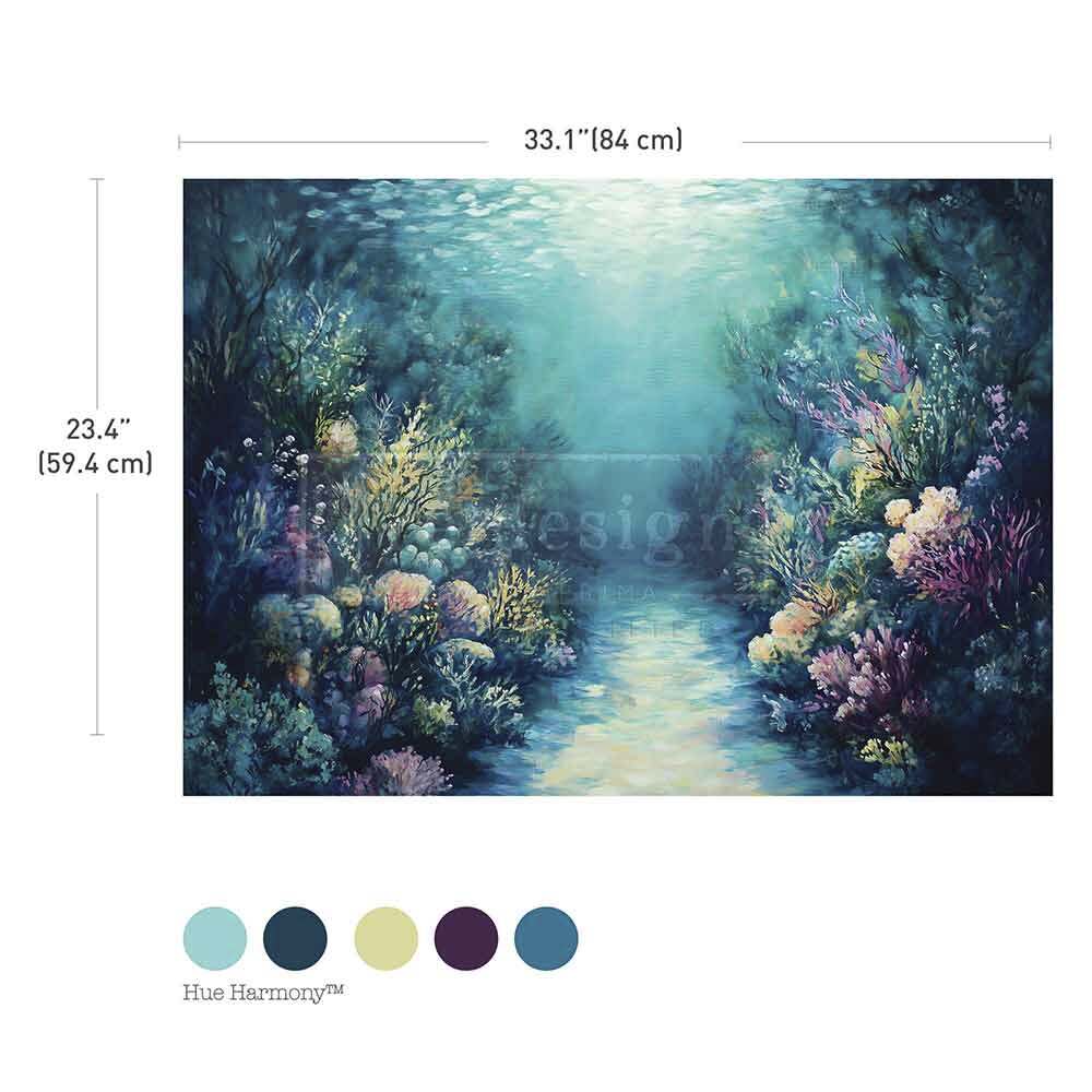 An atmospheric reef scene rich in moody blues, glowing coral blooms, and a soft trail of light leading through the depths. Coral Dreams adds mystery and depth to any surface with its blend of shadow and luminous detail.