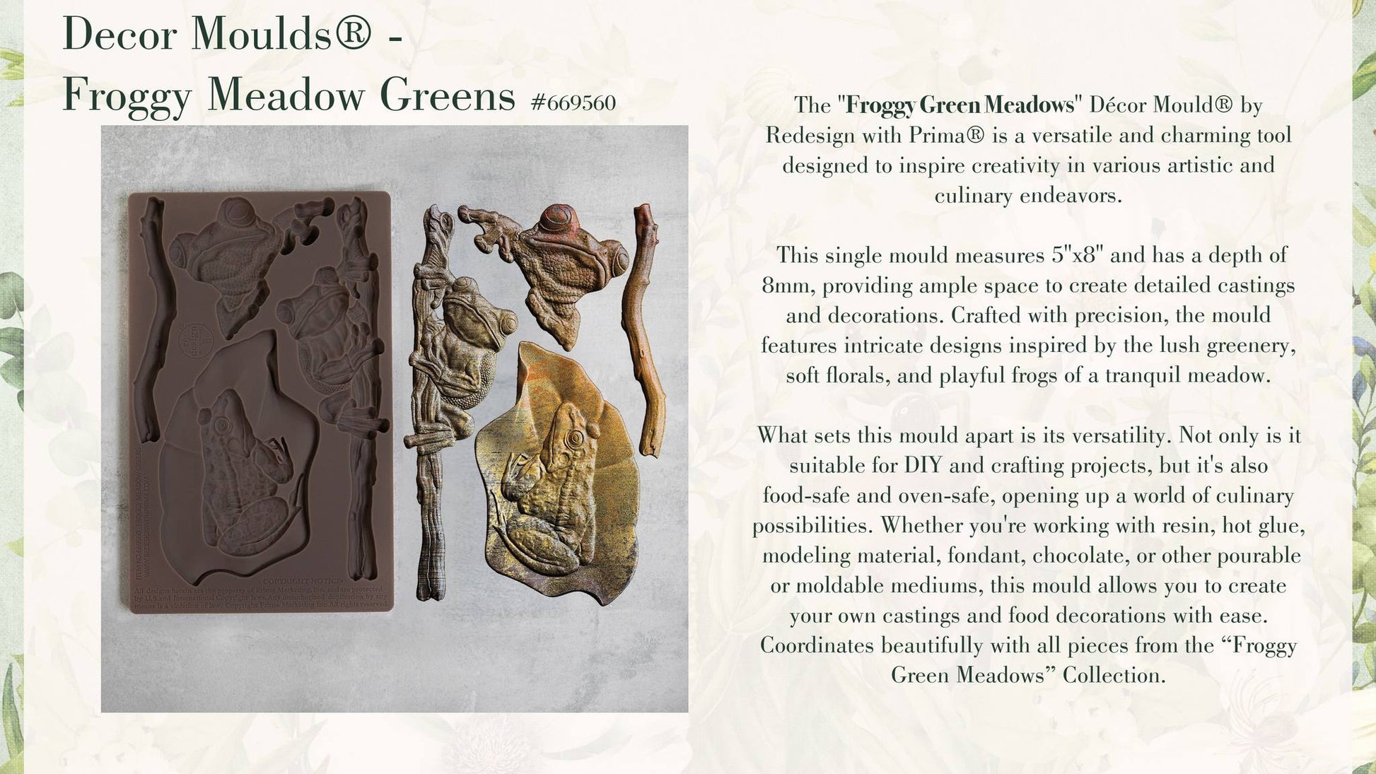 | "1 pc, 5""x8""x8mm - The ""Froggy Green Meadows"" Décor Mould® by Redesign with Prima® is a versatile and charming tool designed to inspire creativity in various artistic and culinary endeavors. This single mould measures 5""x8"" and has a depth of 8mm, providing ample space to create detailed castings and decorations. Crafted with precision, the mould features intricate designs inspired by the lush greenery, soft florals, and playful frogs of a tranquil meadow. What sets this mould apart is its versatility. Not only is it suitable for DIY and crafting projects, but it's also food-safe and oven-safe, opening up a world of culinary possibilities. Whether you're working with resin, hot glue, modeling material, fondant, chocolate, or other pourable or moldable mediums, this mould allows you to create your own castings and food decorations with ease. Coordinates beautifully with all pieces from the “Froggy Green Meadows” Collection. " |