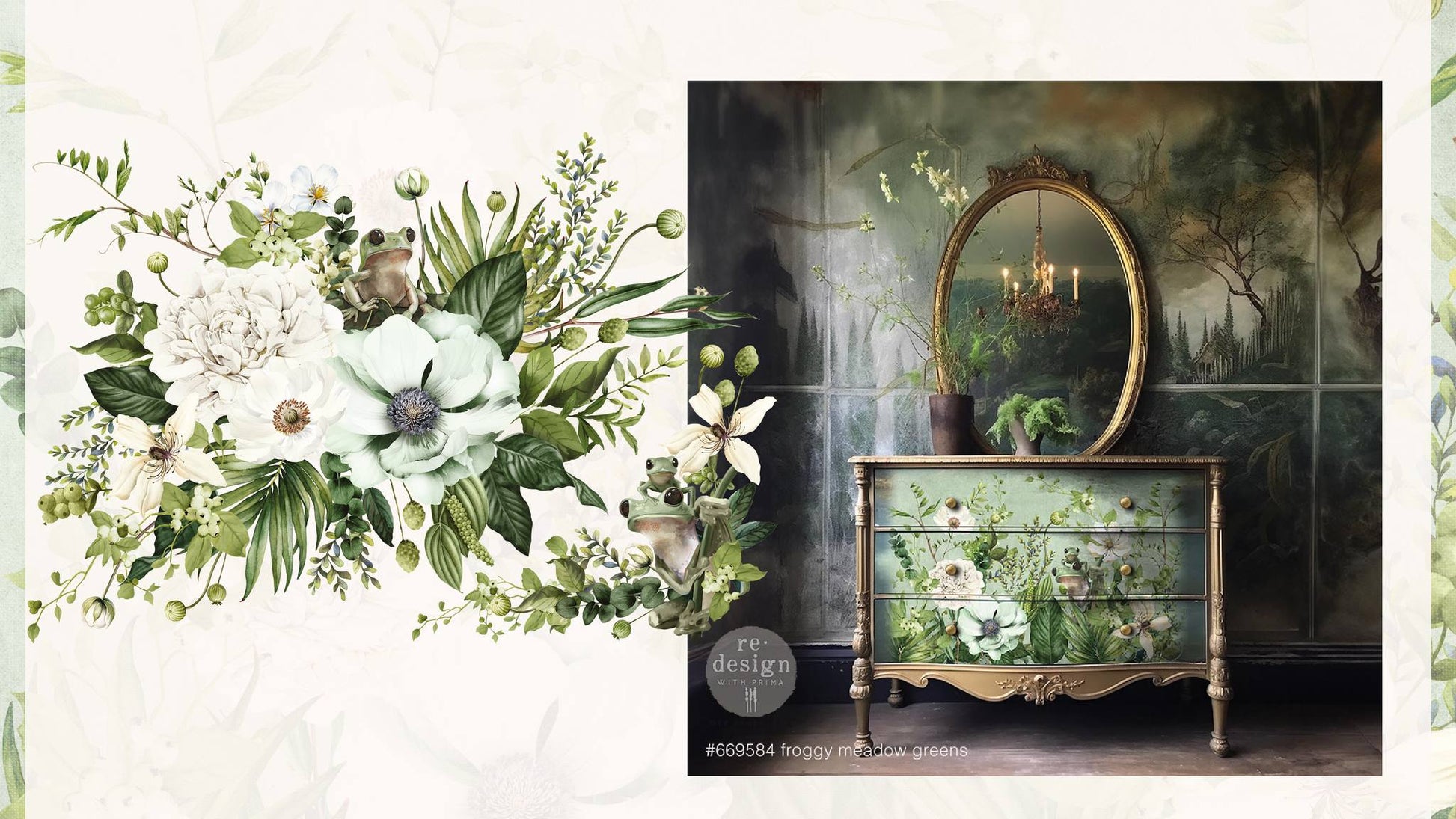 | "total sheet size 24""x35"", cut into 2 sheets - The “Froggy Green Meadows” large Décor Transfer® by Redesign with Prima®. captures the essence of a whimsical meadow, with lush greenery and delicate florals that evoke the beauty of nature. Measuring 24""x35"", it provides ample coverage for larger projects, allowing you to transform your space with ease. The design features sweet, soft florals intertwined with vibrant green foliage, creating a serene and inviting atmosphere. But the true star of the transfer are the adorable little frogs nestled within the bouquet, adding a playful touch to the scene. Crafted with meticulous attention to detail, this transfer is easy to apply, requiring only a prepped surface, and a gentle rub to transfer the design. Simply peel off the backing paper, place the transfer onto your desired surface, and rub it with the included tool to transfer the design. The transfer may be cut and rearranged to fit your specific needs, making it a versatile and customizable choice for all your Décor projects. Seal with your favorite water-based sealer or clear wax. Once applied, it seamlessly integrates into your decor, giving any surface a fresh, artistic makeover. Whether you're upcycling furniture, decorating walls, or adding flair to other home accents, the “Froggy Green Meadows” transfer promises to bring a touch of natural beauty and whimsy to your space. " |