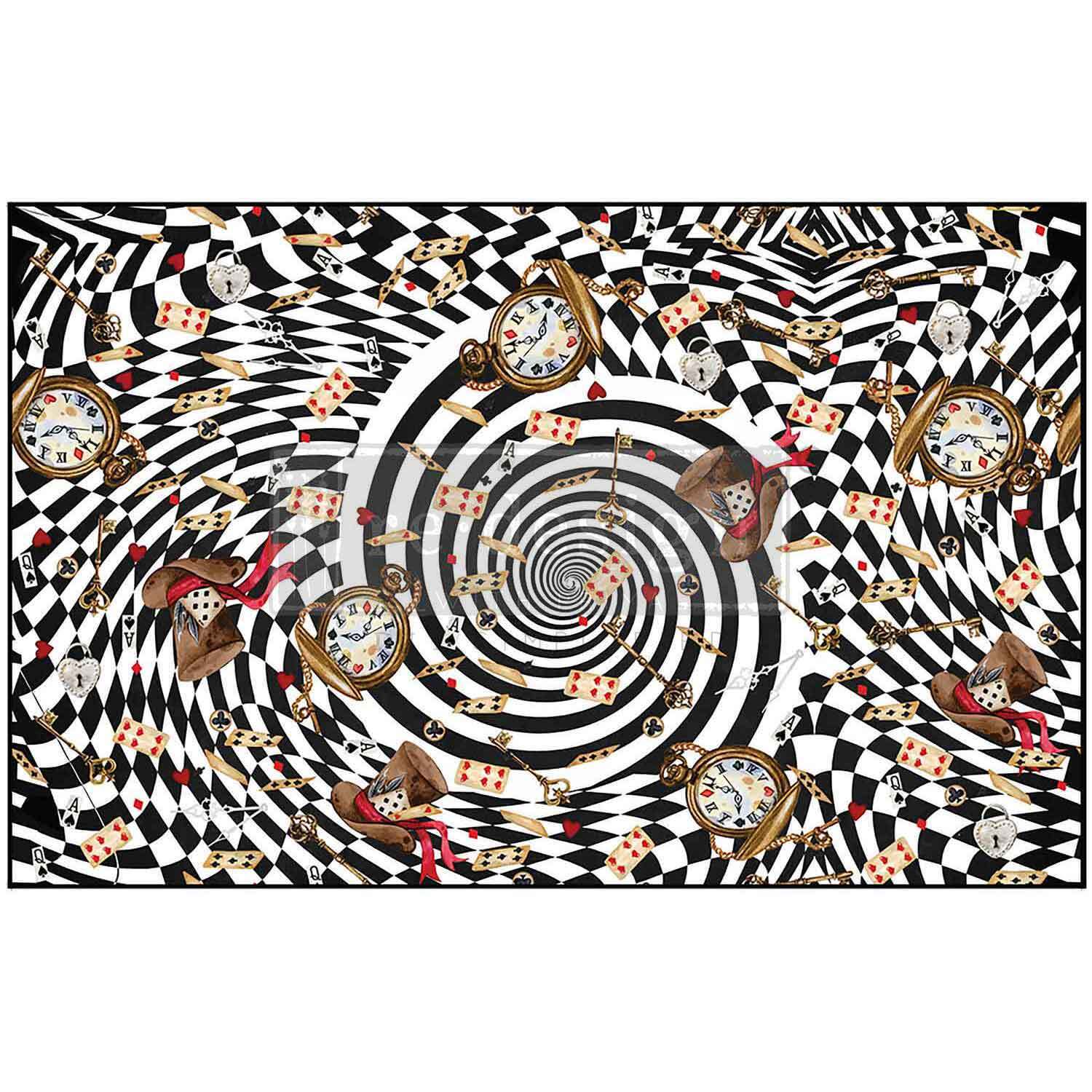 | "1 sheet, 19.5""x30"" - Feel the dizzying magic of the Mad Hatter's tea party come alive with the ""Tea Party Whirlwind"" Découpage Décor Tissue Paper®! Imagine being caught in the swirl of Wonderland’s most chaotic gathering—where teacups twirl, clocks spin, and everything feels like a delightful, topsy-turvy dream. The black-and-white checkered spiral draws you in, pulling you right into the heart of the madness. It’s not just decor; it’s an invitation to get lost in the whimsical world of Alice, where nothing is as it seems, and every detail is a playful twist on reality. This specialty tissue paper is designed with a fibrous texture that adds both durability and a unique finish to your projects. Its thicker material is tear-resistant, ensuring your work remains vibrant and intact. Perfect for furniture makeovers or collage creations, it pairs beautifully with our soft gloss gel or soft matte gel for a flawless, long-lasting application. Bring a touch of Wonderland’s whirlwind charm to your next project!" |