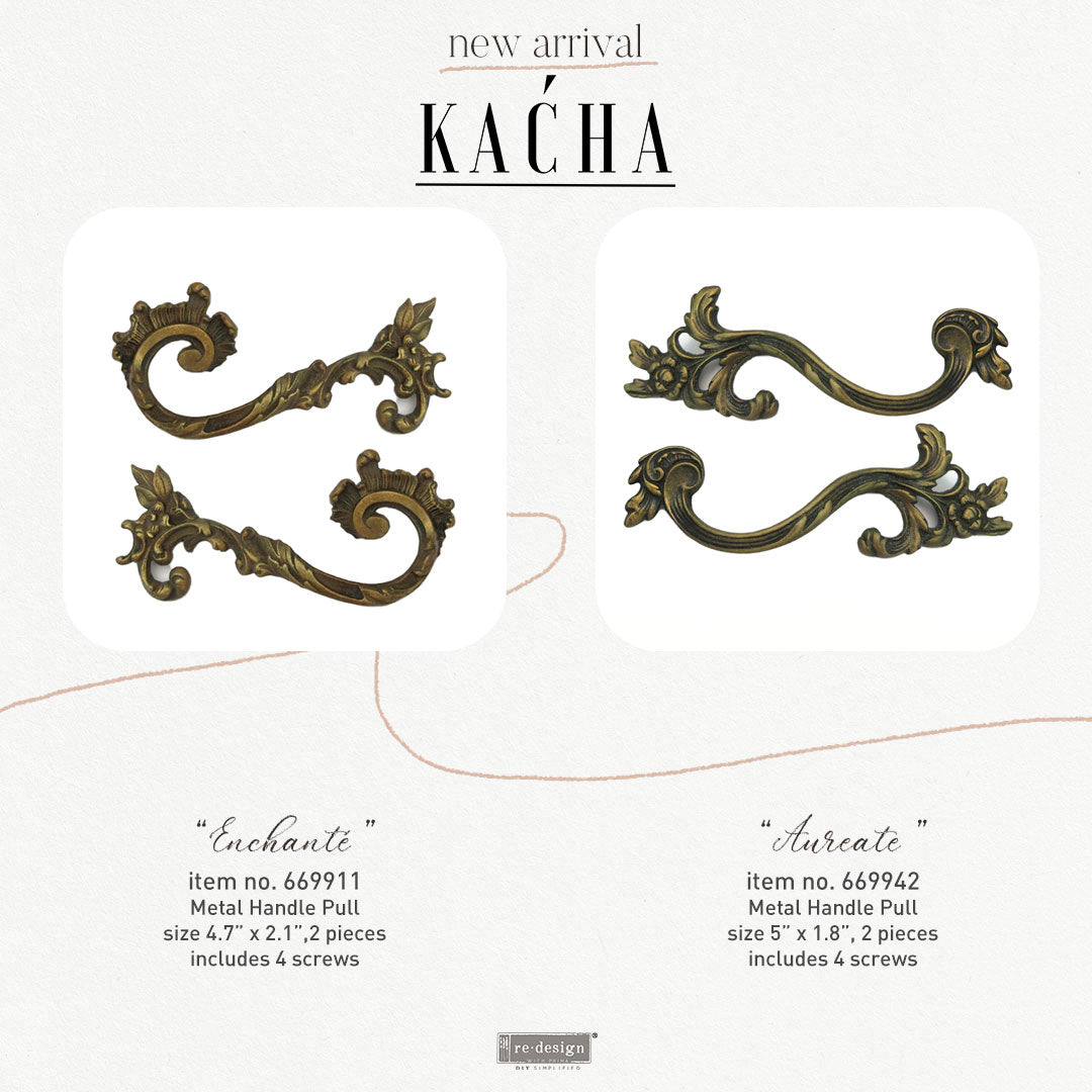 | "The ""Aureate"" and ""Enchanté"" metal pulls from the Kacha collection are not just handles; they're the jewelry your furniture didn't know it needed. These pieces, complete with mounting screws, are crafted to transform any piece of furniture into a statement of elegance. With intricate detailing and a luxurious finish, they'll add that special Kacha touch of charm to your decor. 2 pcs, 4.7""x2.1"" + 4 screws - Beautiful and detailed these metal pulls designed by Kacha will add beautiful charm and elegance to any of your furniture and decor pieces. Includes 2 pieces with mounting screws." |