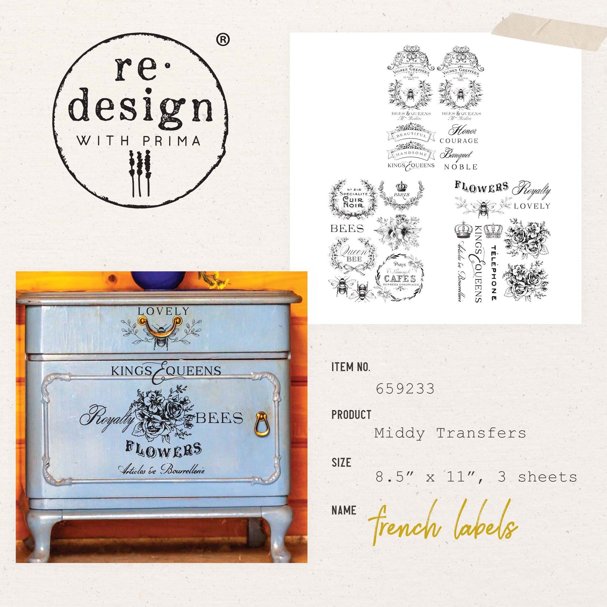 French Labels in Sable Black are a MUST HAVE staple for transforming jars, vases, pots, storage containers, and more! With beautifully detailed designs on three unique sheets, these Middy transfers include delightful French designs that will transform anything you wish! To Use: Peel backing sheet from transfer and set on prepared surface. Rub on transfer with included stick or Transfer Tool. Remove top sheet and burnish with soft cloth. Seal, if desired, with water-based poly or wax.