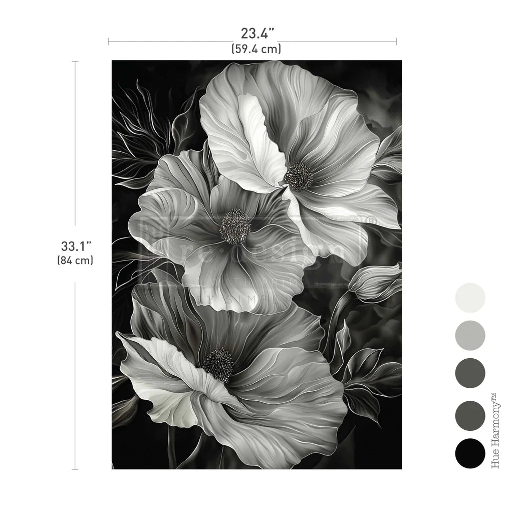 Delicate Matilija poppies bloom in sweeping shades of ivory and shadowy gray, set against a jet-black background for a look that’s bold, sculptural, and effortlessly chic. Moonlight Matilija is drama and softness all in one—perfect for high-contrast decor and modern floral lovers.